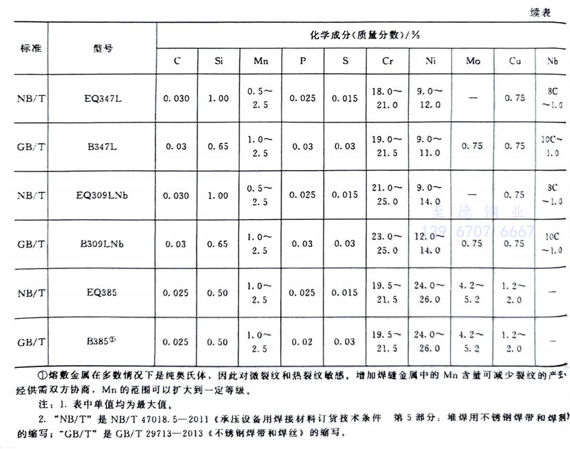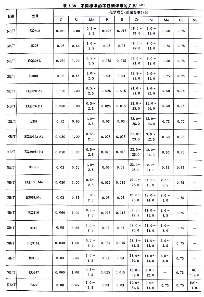 NB/T 47018.5-2011標(biao)準(zhun)對S、P含量(liang)(liang)的(de)(de)限制嚴于GB/T 29713-2013標(biao)準(zhun)。NB/T 47018.5-2011標(biao)準(zhun)焊(han)帶(dai)(dai)(dai)(dai)Mo含量(liang)(liang)上限普(pu)遍(bian)低于GB/T 29713-2013標(biao)準(zhun)要求。NB/T 47018.5-2011標(biao)準(zhun)規定的(de)(de)焊(han)帶(dai)(dai)(dai)(dai)與GB/T 29713-2013標(biao)準(zhun)規定的(de)(de)焊(han)帶(dai)(dai)(dai)(dai)之間的(de)(de)關系見(jian)表(biao)2-38。通過表(biao)2-38的(de)(de)數(shu)據(ju)可得知兩(liang)標(biao)準(zhun)的(de)(de)焊(han)帶(dai)(dai)(dai)(dai)化學(xue)成分比較接近(鄰近的(de)(de)焊(han)帶(dai)(dai)(dai)(dai)牌號),但沒有完全(quan)符合的(de)(de)焊(han)帶(dai)(dai)(dai)(dai)。