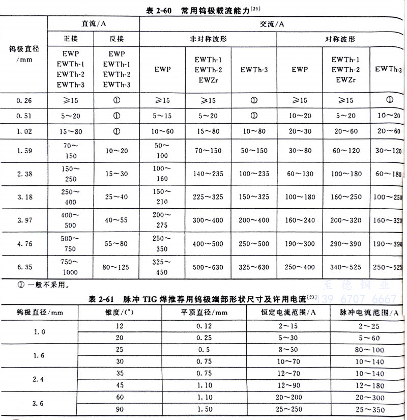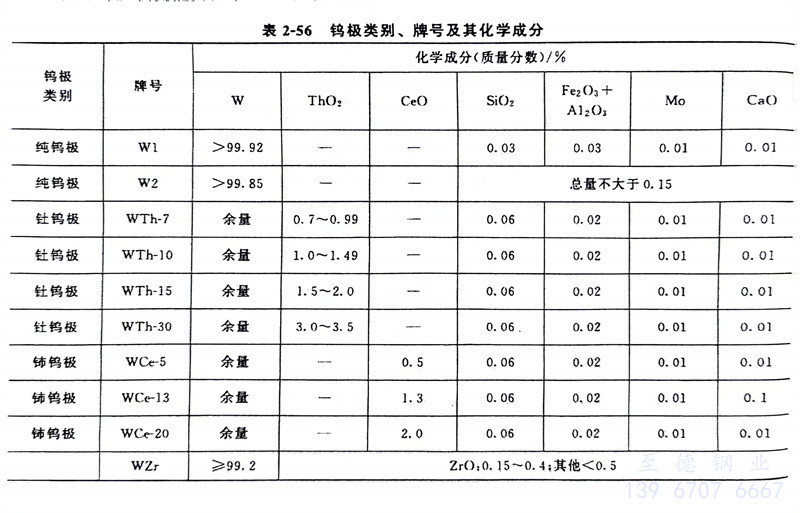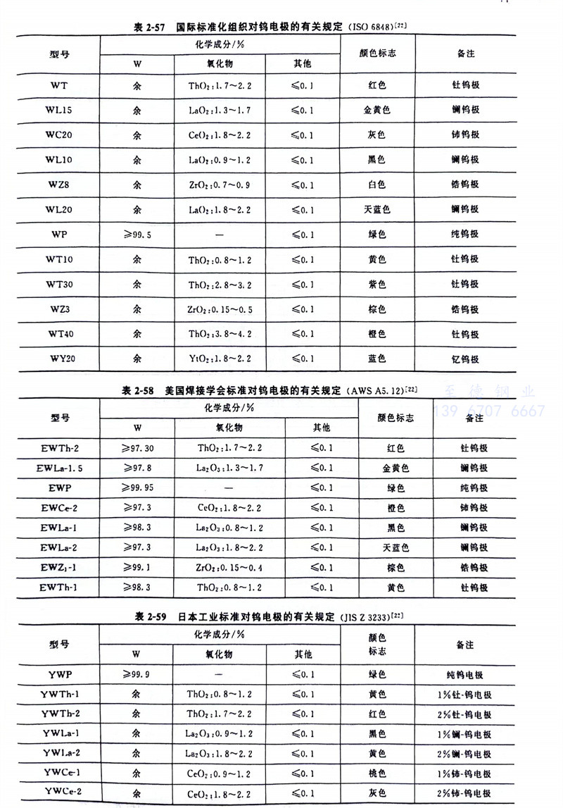 有關鎢極(ji)(ji)類別、牌號及其化(hua)學成分見(jian)表(biao)2-56;國外鎢極(ji)(ji)型(xing)號化(hua)學成分見(jian)表(biao)2-57~表(biao)2-59。常用(yong)鎢極(ji)(ji)載流能力見(jian)表(biao)2-60、表(biao)2-61。