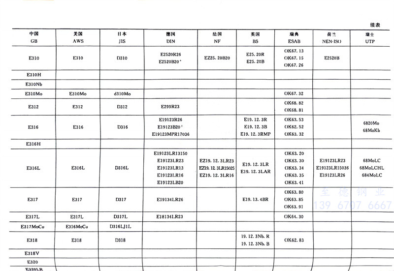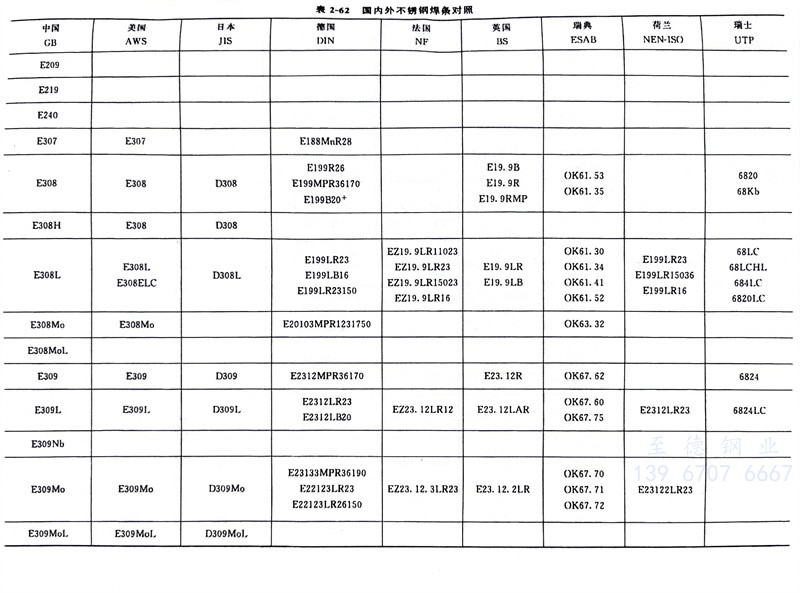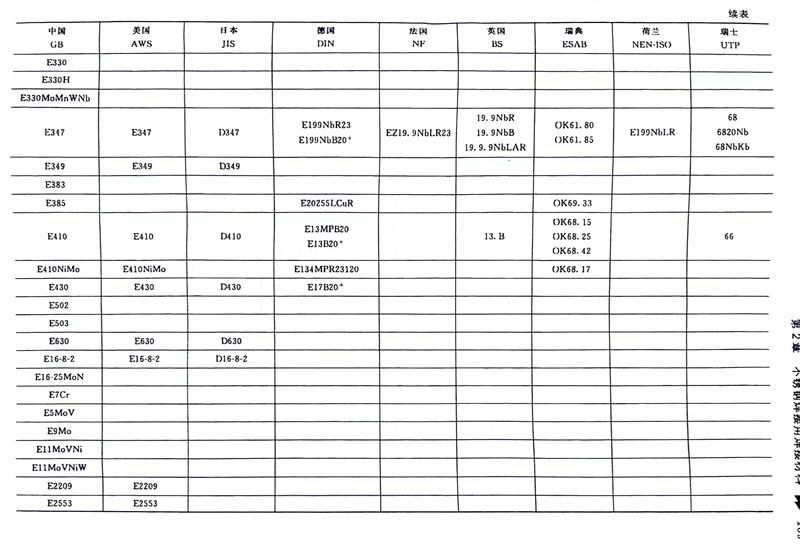 我國GB/T 983-2012《不(bu)銹(xiu)(xiu)(xiu)鋼(gang)焊(han)(han)條(tiao)》型(xing)號(hao)編排規則基本上采用(yong)美國AWS A5.4M:2006《耐蝕(shi)鉻鋼(gang)及鎳鋼(gang)焊(han)(han)條(tiao)》的(de)規定。我國不(bu)銹(xiu)(xiu)(xiu)鋼(gang)焊(han)(han)條(tiao)牌號(hao)、型(xing)號(hao)與美國AWS A5.4M標(biao)(biao)準的(de)對應關系見表(biao)(biao)2-4、表(biao)(biao)2-6、表(biao)(biao)2-62。日本工業標(biao)(biao)準JIS Z3221不(bu)銹(xiu)(xiu)(xiu)鋼(gang)焊(han)(han)條(tiao)標(biao)(biao)準直接(jie)采用(yong)美國AWS A5.4M標(biao)(biao)準焊(han)(han)條(tiao)類別號(hao),只是在焊(han)(han)條(tiao)型(xing)號(hao)的(de)三(san)個(ge)數字前(qian)加(jia)(jia)“D”而不(bu)是“E”,例(li)如(ru)JIS D308L-16,JIS D316-16等,日本不(bu)銹(xiu)(xiu)(xiu)鋼(gang)焊(han)(han)條(tiao)與中國不(bu)銹(xiu)(xiu)(xiu)鋼(gang)焊(han)(han)條(tiao)對應關系見表(biao)(biao)2-62。韓國的(de)KS標(biao)(biao)準也采用(yong)AWS類別號(hao),只是在焊(han)(han)條(tiao)型(xing)號(hao)的(de)三(san)個(ge)數字前(qian)加(jia)(jia)“D”而不(bu)是“E”,例(li)如(ru) KS D308L-16,KS D316-16等。