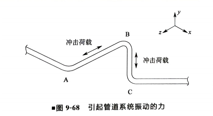 如圖(tu)9-68所示(shi),管道(dao)系(xi)統的每段管子都可能(neng)承受潛在沖(chong)擊載(zai)(zai)荷(he)的作(zuo)(zuo)用(yong)(yong)(yong)。流體產生的沖(chong)擊載(zai)(zai)荷(he)存在于管道(dao)的軸(zhou)線(xian)方向(xiang),作(zuo)(zuo)用(yong)(yong)(yong)在管道(dao)方向(xiang)發生變化(hua)的位置。圖(tu)9-68所示(shi)系(xi)統,沖(chong)擊荷(he)載(zai)(zai)會作(zuo)(zuo)用(yong)(yong)(yong)在A-B和(he)B-C管道(dao)軸(zhou)線(xian)上(shang)。