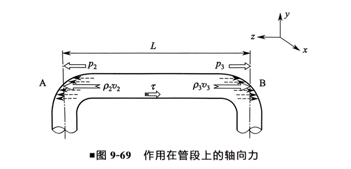在計算(suan)中,假(jia)設(she)介質是在固定住(zhu)的管(guan)道(dao)中流動(v1),不考慮管(guan)道(dao)本身振動的影響,作(zuo)用在管(guan)道(dao)上的流體載荷(he)計算(suan)見圖9-69所(suo)示(shi):