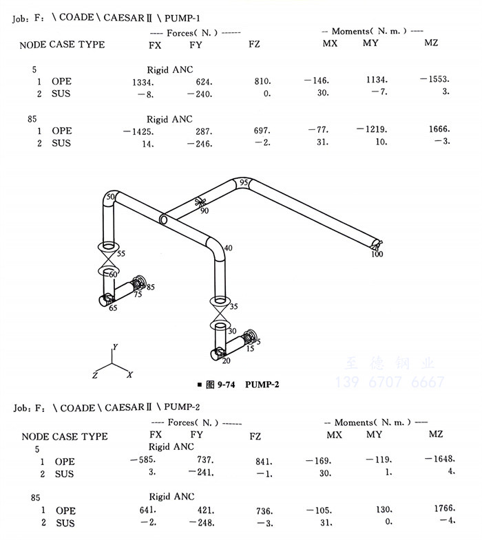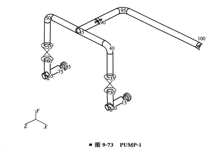 下面是一個典型的泵入口管線的應力分析過程(圖9-73)。在節點20和65處只是一個承重架,從Caesar Ⅱ計算的結果可以得出,在泵入口節點5和85上的荷載偏大(MY,FX)。現在節點20和65處各加一個導向架(X向約束)(圖9-74),這時,從Caesar II計算的相應結果可以得出,在泵入口節點5和85上的荷載已經降了下來,這說明適當調整管架的形式可以降低設備口的荷載。