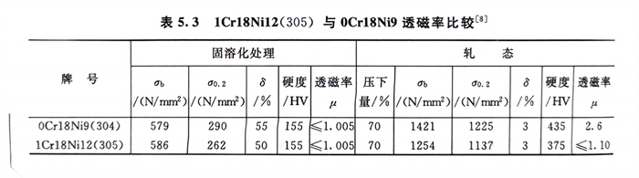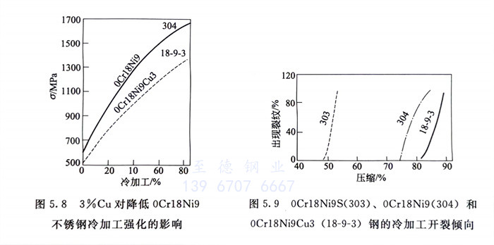 1Cr18Ni12和(he)(he)0Cr18Ni9Cu3,前者(zhe)是通(tong)過提高1Cr18Ni9鋼的鎳(nie)含量,使(shi)奧氏(shi)體更(geng)(geng)加(jia)穩定,經較大(da)冷變(bian)形后(hou),可基本上不產生馬(ma)氏(shi)體相(xiang)變(bian),既(ji)可使(shi)鋼的冷加(jia)工(gong)(gong)硬化傾(qing)向小(xiao)(xiao)(xiao),更(geng)(geng)易(yi)于(yu)(yu)冷加(jia)工(gong)(gong)成型,減少中間退火次數。同時,由于(yu)(yu)固溶態與軋態的透磁(ci)率變(bian)化很小(xiao)(xiao)(xiao)(表(biao)5.3),較0Cr18Ni9(304)更(geng)(geng)適于(yu)(yu)無磁(ci)用(yong)(yong)途。而0Cr18Ni9Cu3則(ze)系(xi)加(jia)入(ru)銅使(shi)奧氏(shi)體更(geng)(geng)加(jia)穩定,冷加(jia)工(gong)(gong)過程(cheng)轉變(bian)為馬(ma)氏(shi)體的敏感(gan)性降低,從而使(shi)鋼的冷作(zuo)硬化傾(qing)向和(he)(he)冷作(zuo)速率以(yi)及(ji)冷開裂(lie)敏感(gan)性下(xia)降,使(shi)此鋼在(zai)較小(xiao)(xiao)(xiao)變(bian)形力作(zuo)用(yong)(yong)下(xia)可獲得最大(da)的冷變(bian)形,因此,0Cr18Ni9Cu3更(geng)(geng)適于(yu)(yu)緊固件和(he)(he)深(shen)沖、深(shen)拉(la)等用(yong)(yong)途。圖5.8和(he)(he)圖5.9系(xi)一些試驗結果。