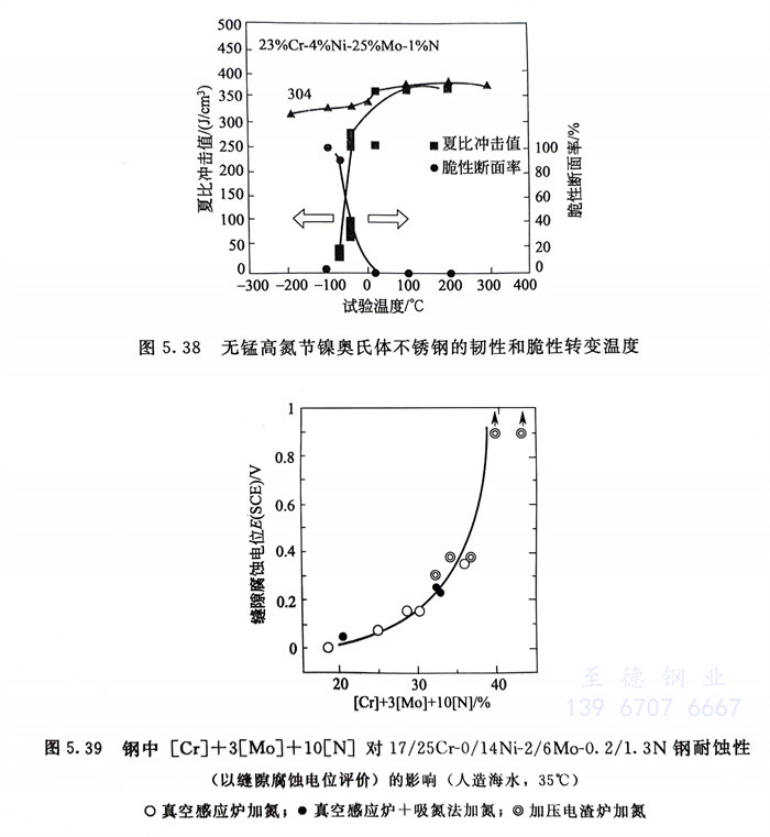 國(guo)外用加壓電(dian)渣爐冶煉了高氮(0.5%~1.5%N)無(wu)錳(meng)節鎳(nie)的(de)Cr-Mo-Ni-N 和無(wu)錳(meng)無(wu)鎳(nie)的(de)Cr-Mo-N不銹鋼并研究(jiu)了它們的(de)性能(見圖5.37~圖5.39)。