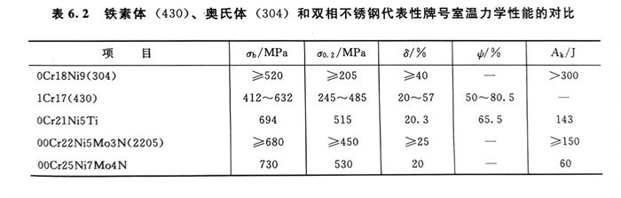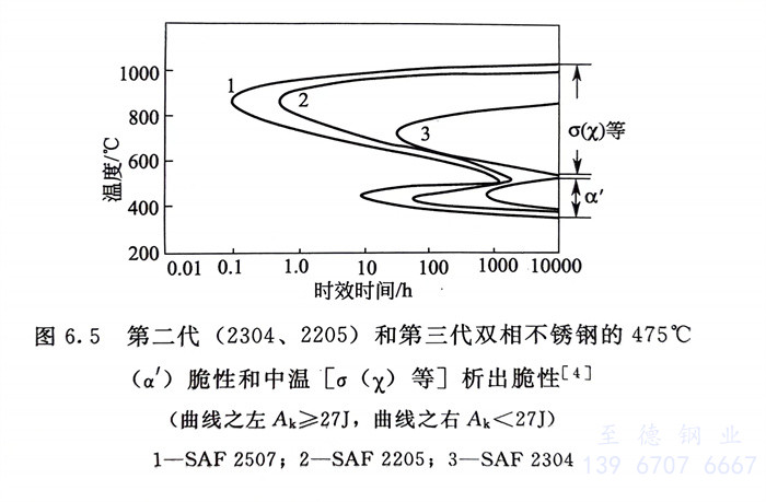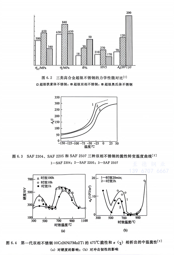 高強度,存在脆性轉變溫度和三個脆性區。由于雙相不銹鋼具有微細的顯微組織以及鉬、氮等的強化作用,雙相不銹鋼的強度遠遠高于鐵素體不銹鋼和奧氏體不銹鋼,一些試驗結果見表6.2和圖6.2。但是,雙相不銹鋼中含高鉻、鉬的大量鐵素體相的存在,使得鐵素體不銹鋼中所具有的脆性轉變溫度和475℃脆性、中溫脆性以及高溫脆性三個脆性區的特征,在雙相不銹鋼中也顯現了出來(圖6.3~圖6.5系475℃和中溫脆性的情況)。但是由于雙相不銹鋼的晶粒細化且又存在大量奧氏體,所以雙相不銹鋼的脆性轉變溫度明顯低于普通鐵素體不銹鋼,一般均在-40℃或一50℃以下,而且室溫沖擊韌性也足夠高(表6.2),因此并不影響雙相不銹鋼的工程應用。至于475℃脆性和中溫脆性只要不高于260℃,長期使用就不會有任何危險。