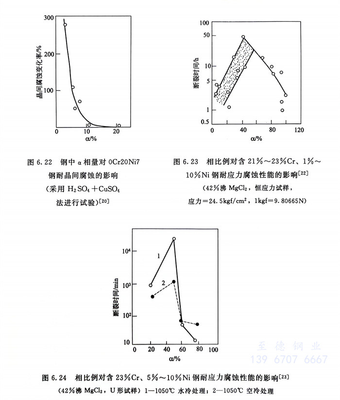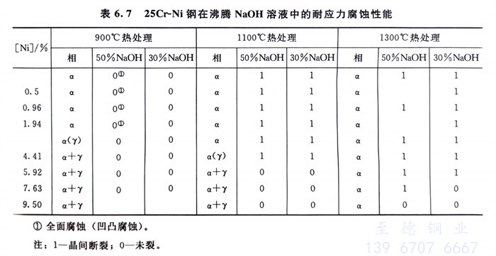 在氯化物中和在NaOH中的試驗結果見圖6.23、圖6.24及表6.7。可以看出,在42%沸MgCl2中,當α相比例在40%~50%時,此鋼具有最佳的耐應力腐蝕性能,而在NaOH堿溶液中,只要具有α+γ雙相結構,鋼的耐應力腐蝕性能便優于單相鐵素體(注意此時鋼中含鎳,為含鎳的鐵素體組織)時的性能,1100℃以上固溶處理時,單相鐵素體呈沿晶斷裂。