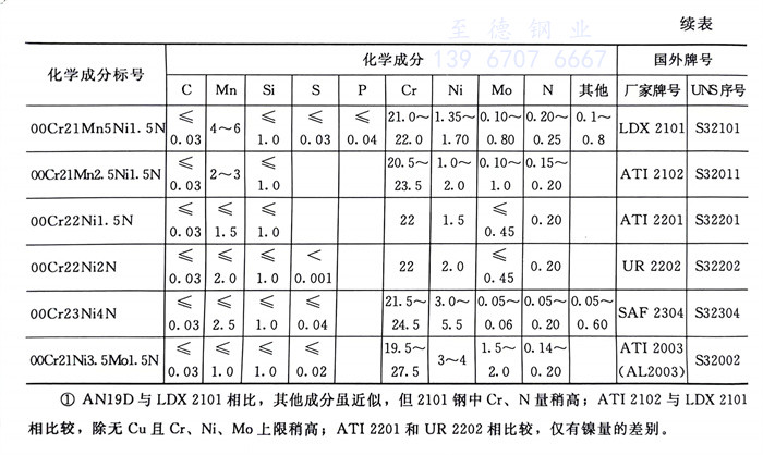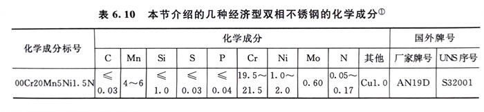 經濟型雙相不銹鋼系指現代雙相不銹鋼(gang)中低鎳無鉬和少鉬的那些牌號,其中的幾個主要牌號及其化學成分列入表6.10中。除00Cr23Ni4N(SAF 2304)外,多種經濟型雙相不銹(xiu)鋼管都是2000年以來陸續面世的。例如,AN19D (00Cr20Mn5Ni1.5N),LDX 2101 (00Cr21Mn5Ni1.5N),ATI 2101(00Cr21Mn2.5Nil.5N), ATI 2201 (00Cr22Nil.5N),UR 2202(00Cr22Ni2N),SAF 2404和 ATI 2003 (00Cr21Ni3.5Mo1.5N)等,本節僅對表6.10中所列牌號進行扼要介紹。