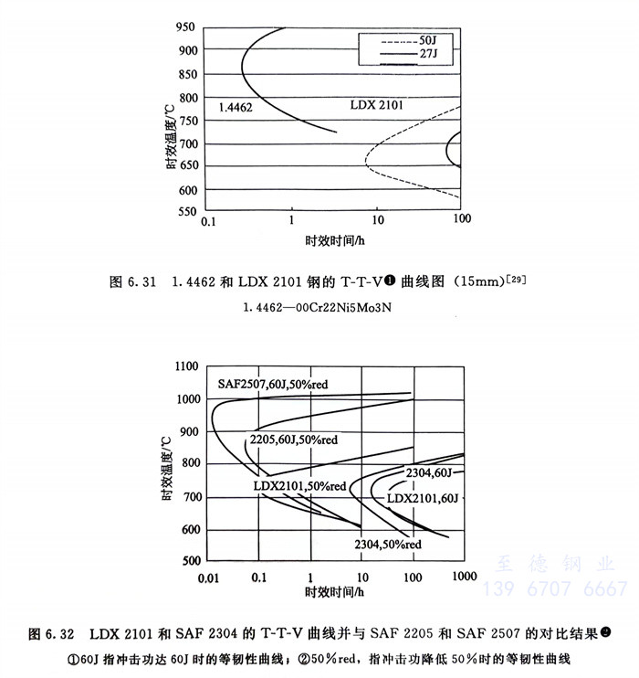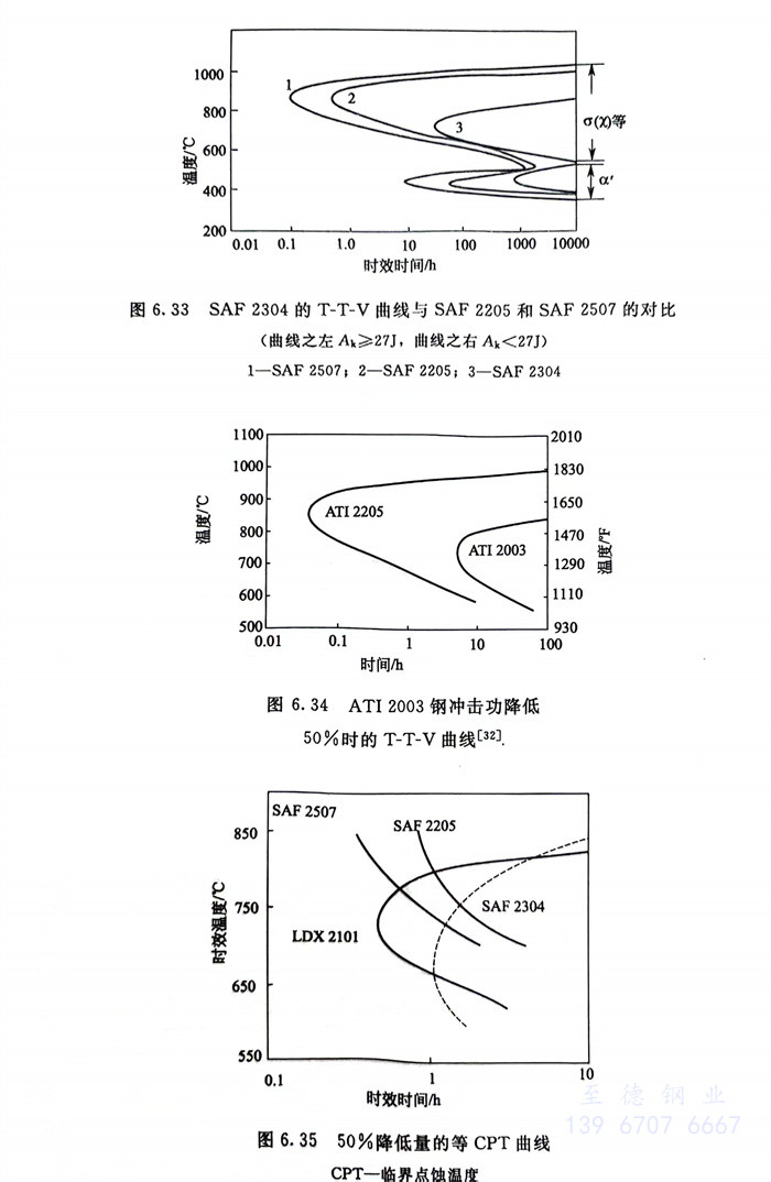 圖6.31~圖6.34系時效處理對LDX 2101,SAF 2304和ATI 2003三種經濟型雙相不銹鋼韌性影響曲線,并與SAF 2205和SAF 2507對比的結果。顯然,鋼的熱穩定性SAF 2304>LDX 2101>ATI 2003>SAF 2205>SAF 2507,而對脆性的敏感性則為SAF 2507>SAF 2205>ATI 2003>LDX 2101>SAF 2304。