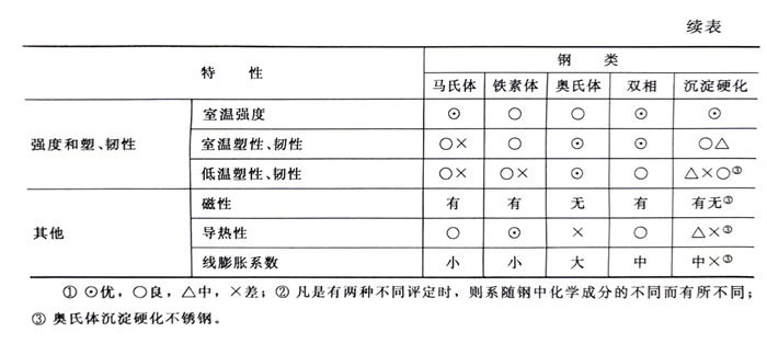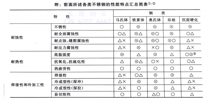 下(xia)面的附表系前面所述五大(da)類不銹鋼性(xing)能特點的簡要匯(hui)總,供(gong)讀者參(can)考。