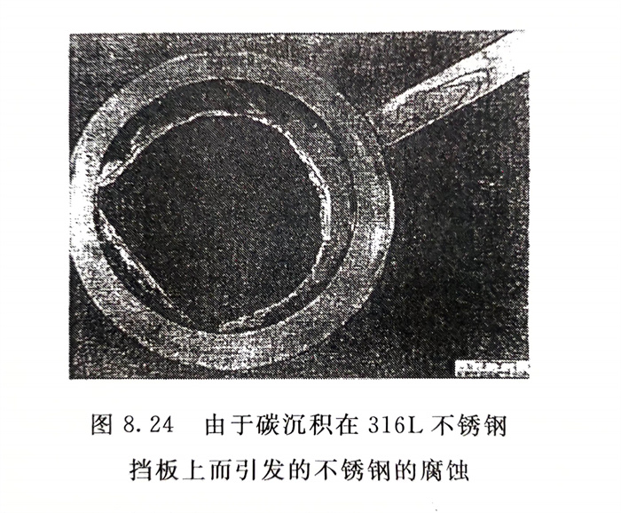 圖8.24則系在含NaOH的介質中,石墨熱交換器的碳沉積在316L(022Cr17Ni12Mo2)不銹鋼擋板上而引起的316L不銹鋼管的腐蝕。