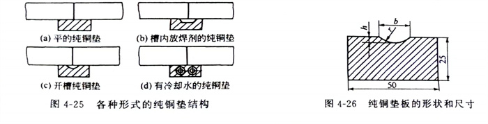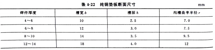 這種焊(han)(han)(han)(han)接方法能使(shi)焊(han)(han)(han)(han)接構件(jian)達到單(dan)面(mian)(mian)(mian)焊(han)(han)(han)(han)背(bei)面(mian)(mian)(mian)成形(xing)的目(mu)的。純(chun)(chun)銅(tong)(tong)墊靠焊(han)(han)(han)(han)接夾具緊貼待焊(han)(han)(han)(han)接頭下面(mian)(mian)(mian),它與(yu)焊(han)(han)(han)(han)件(jian)之間的間隙不(bu)允許大于0.5mm,各種形(xing)式的純(chun)(chun)銅(tong)(tong)墊結構如(ru)圖4-25所示,純(chun)(chun)銅(tong)(tong)墊板的形(xing)狀和尺寸見圖4-26和表4-22。在純(chun)(chun)銅(tong)(tong)墊接觸焊(han)(han)(han)(han)件(jian)的一面(mian)(mian)(mian)開槽,槽的中心要(yao)與(yu)坡口根間隙對準,如(ru)果(guo)在槽內(nei)放焊(han)(han)(han)(han)劑(ji)[見圖4-25(b)],則檀的寬(kuan)度(du)和深度(du)都要(yao)相應地加寬(kuan)加深。