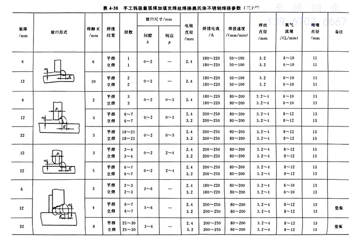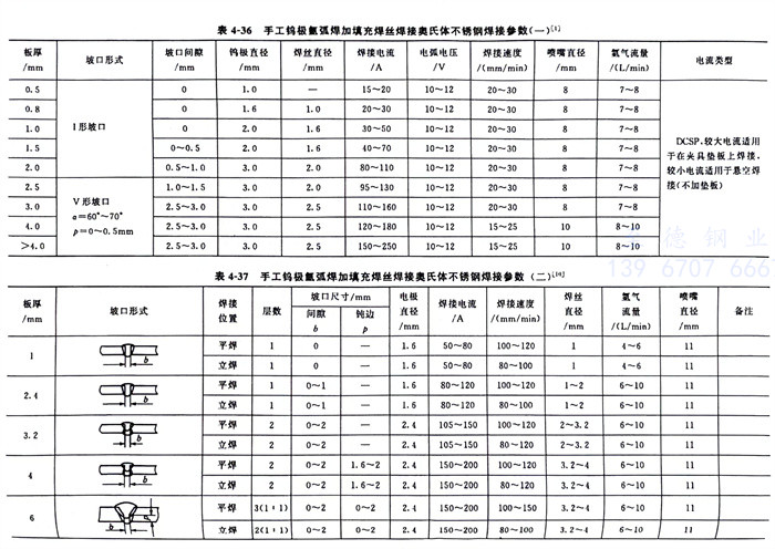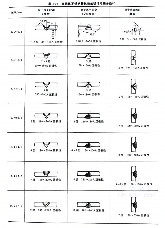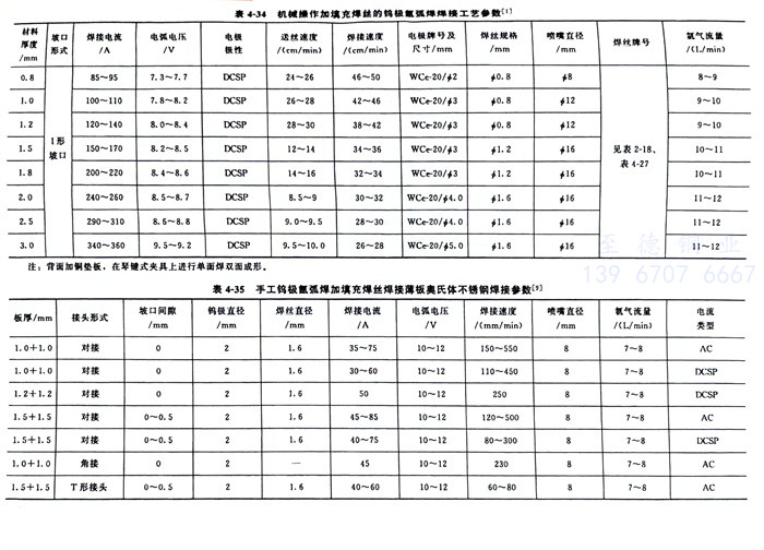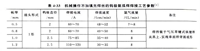 機械操作不(bu)加填(tian)充焊(han)(han)絲(si)的(de)(de)鎢極(ji)氬(ya)(ya)弧焊(han)(han)焊(han)(han)接(jie)工藝參數,見(jian)表(biao)(biao)4-33;機械操作加填(tian)充焊(han)(han)絲(si)的(de)(de)鎢極(ji)氬(ya)(ya)弧焊(han)(han)焊(han)(han)接(jie)工藝參數,見(jian)表(biao)(biao)4-34;鎢極(ji)氬(ya)(ya)弧焊(han)(han)加填(tian)充焊(han)(han)絲(si)焊(han)(han)接(jie)薄板奧氏體(ti)不(bu)銹(xiu)鋼焊(han)(han)接(jie)參數,見(jian)表(biao)(biao)4-35;手工鎢極(ji)氬(ya)(ya)弧焊(han)(han)加填(tian)充焊(han)(han)絲(si)的(de)(de)焊(han)(han)接(jie)參數,見(jian)表(biao)(biao)4-36~表(biao)(biao)4-38,奧氏體(ti)不(bu)銹(xiu)鋼管鎢極(ji)氬(ya)(ya)弧焊(han)(han)焊(han)(han)接(jie)參數,見(jian)表(biao)(biao)4-39。