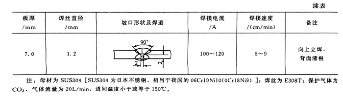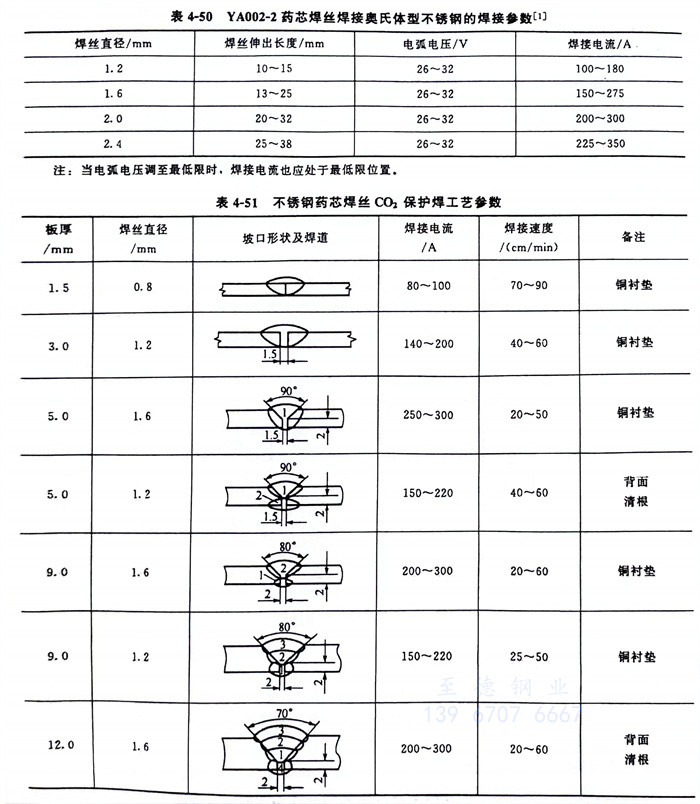 藥芯焊絲氣體保護焊的焊接參數主要有焊接電流、電弧電壓、焊接速度、焊絲伸出長度和保護氣體流量等。當其他條件不變時,焊接電流與送絲速度成正比;焊接電流變化時,電弧電壓要相應的變化;采用純CO2氣體保護時,通常采用長弧法焊接,焊接電流調節范圍廣,可達200~700A,電弧電壓為25~35V。焊絲伸出長度太長會使電弧不穩定,飛濺過大;焊絲伸出長度過短,會造成過多的飛濺物堵塞噴嘴,使氣體保護不好,焊縫中易產生氣孔。通常焊絲伸出長度為19~38mm。平焊位置時焊槍前進方向與焊件之間的傾角為2°~15°;焊接角焊縫時為40°~50°。如果角度太大,會降低氣體保護效果。YA002-2藥芯焊絲焊接奧氏體型不銹鋼的焊接參數見表4-50,不銹鋼藥芯焊絲CO2保護焊工藝參數見表4-51。