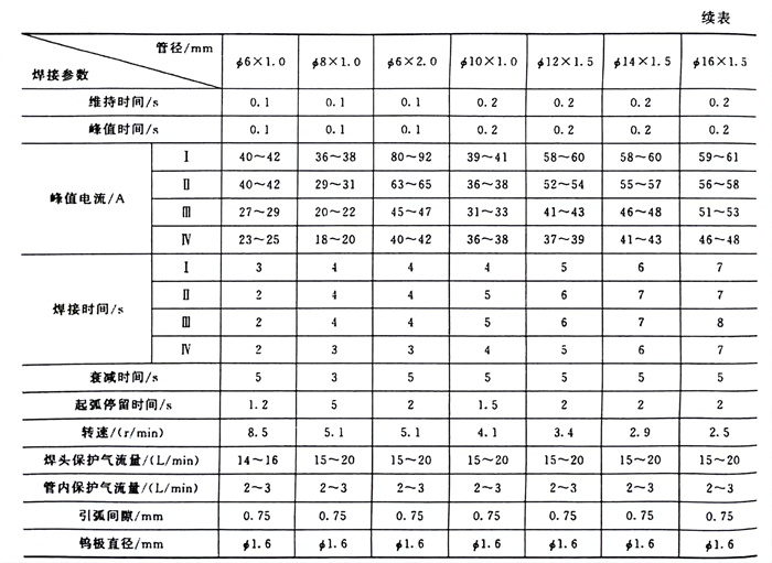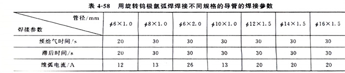 焊(han)接(jie)參(can)數對焊(han)接(jie)質(zhi)量的影(ying)響(xiang)頗大,其中峰(feng)值電流(liu)在(zai)每(mei)個焊(han)接(jie)區域(yu)(導(dao)管固定不動,焊(han)接(jie)分上(shang)、下、左、右4個區)的變化值、引(yin)弧間隙(xi)、氣體流(liu)量、鎢極直徑(jing)等參(can)數變化的影(ying)響(xiang)較(jiao)為突出。經過一系列的焊(han)接(jie)工(gong)藝試驗(yan)得出如表4-58所示的數值。