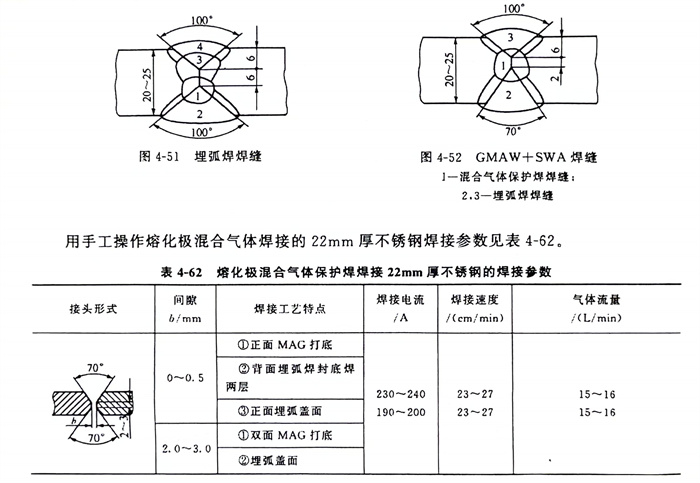 用手工(gong)操作熔化極混合氣體焊接(jie)的22mm厚不銹鋼焊接(jie)參數見表4-62。