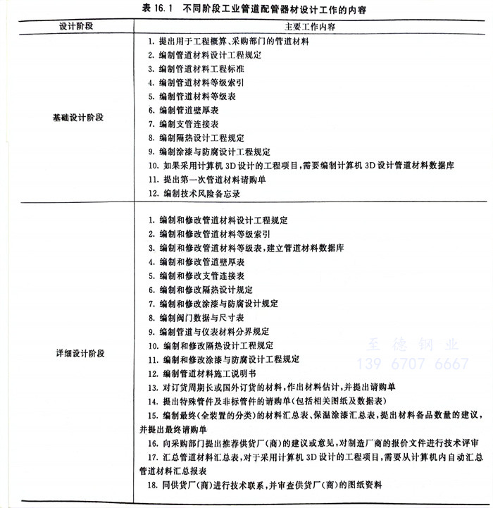 不(bu)同階段工業管(guan)道配(pei)管(guan)器材設計的工作的內容見表(biao)16.1。