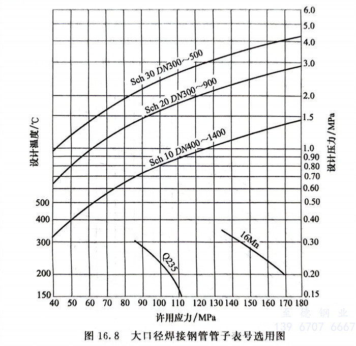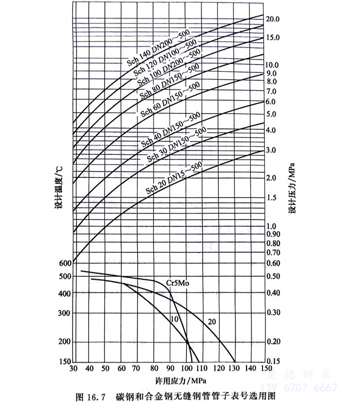 此種表示方法以ASME B36.10《焊接和無縫鋼管》為代表并為其他許多標準所采用,常以“Sch”標示。管子表號是管子設計壓力與設計溫度下材料許用應力的比值乘以1000,并經圓整后的數值。ASME B36.10和JIS標準中,管子表號有:Sch10、Sch20、Sch30、Sch40、Sch60、Sch80、Sch100、Sch120、Sch140、Sch160;ASME B36.19中不銹鋼管管子表號有:5S、10S、40S、80S;中國石化集團公司標準SH3405中,無縫鋼管采用了Sch20、Sch30、Sch40、Sch60、Sch80、Sch100、Sch120、Sch140、Sch160共9個,不銹(xiu)鋼管采用了Sch5S、Sch10S、20S、40S、80S共5個。無縫鋼管和焊接鋼管的管子表號可分別查圖16.7和圖16.8確定。