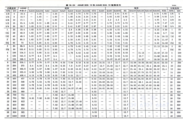 ①. ASME B36.10 和ASME B36.19壁厚系列見表16.24。
