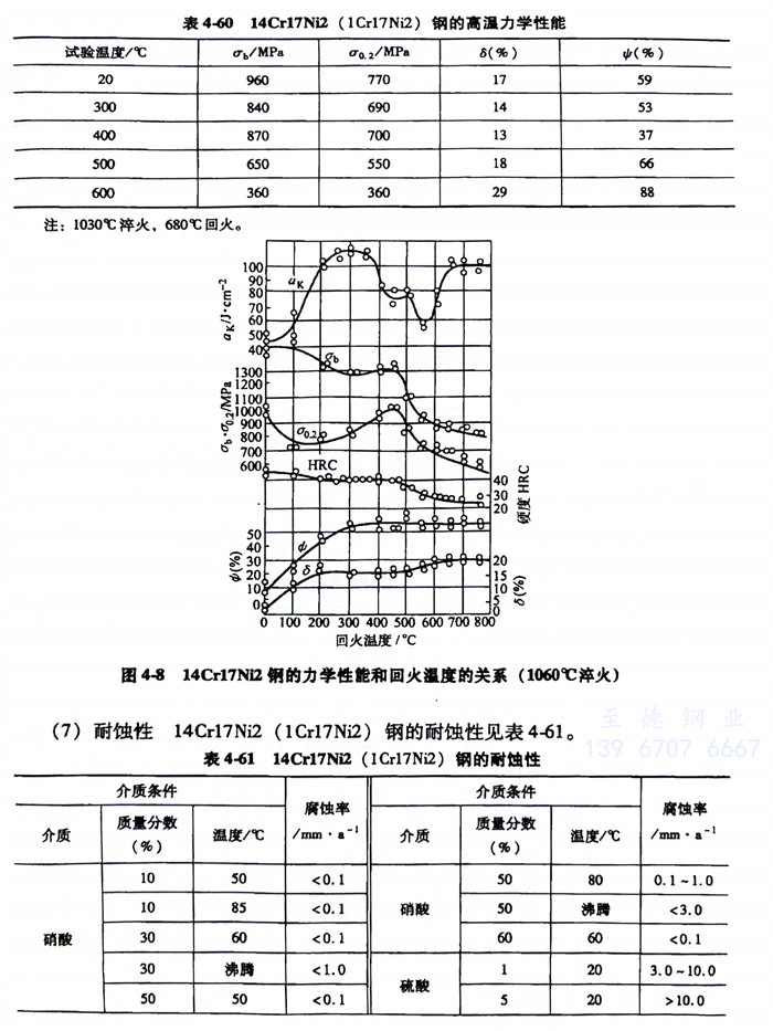 14Cr17Ni2(1Cr17Ni2)不銹鋼(gang)回火溫度對鋼的力學性能的影響及14Cr17Ni2(1Cr17Ni2)鋼的高溫力學性能見表4-59、表4-60和圖4-8。