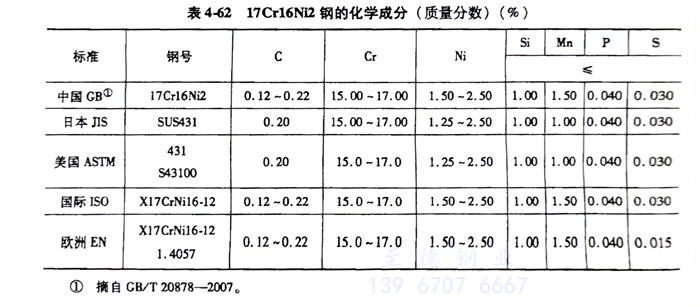 17Cr16Ni2、1.4057、431不(bu)銹鋼的化(hua)學成分(fen)見表(biao)4-62。