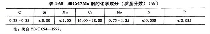 30Cr17Mo 不銹(xiu)鋼的化(hua)學成分(fen)見表4-65。