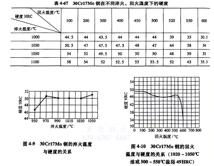 30Cr17Mo 不(bu)銹鋼的淬火(huo)溫(wen)度為(wei)1000~1050℃,油(you)冷(leng)或空冷(leng),硬(ying)度為(wei)48~50HRC;回火(huo)溫(wen)度為(wei)160~180℃,硬(ying)度為(wei)47~48HRC。