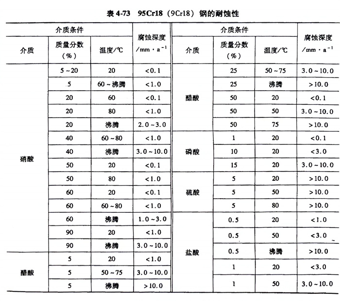 95Cr18 (9Cr18) 不銹(xiu)鋼(gang)的耐蝕性見(jian)表(biao)4-73。