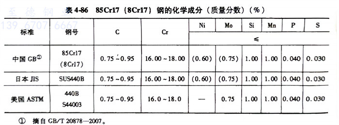 85Cr17(8Cr17)、S44003、SUS440B不銹鋼的化學(xue)成分見表4-86。