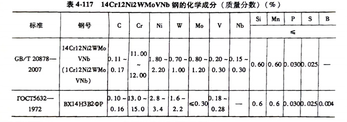 14Cr12Ni2WMoVNb(1Cr12Ni2WMoVNb)不(bu)銹鋼(gang)的化學成分見(jian)表(biao)4-117。