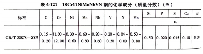18Cr11NiMoNbVN(2Cr11NiMoNbVN)不銹鋼的化學成(cheng)分見表4-121。