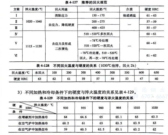 2. 回(hui)(hui)火(huo)規范(fan)見表4-127,不(bu)同回(hui)(hui)火(huo)溫度與硬度的關系見表4-128。