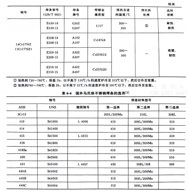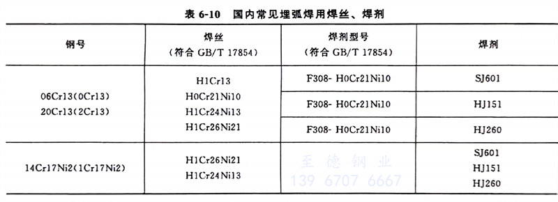 該焊(han)(han)(han)接方(fang)法焊(han)(han)(han)接質量較好,常(chang)用于(yu)薄(bo)板焊(han)(han)(han)接或多層焊(han)(han)(han)打底(di)焊(han)(han)(han)。電極極性采用直流正接。由于(yu)裂紋(wen)傾向小,薄(bo)板焊(han)(han)(han)前(qian)可不預熱,厚(hou)板焊(han)(han)(han)前(qian)需預熱到120~200℃。一般選用與母材成(cheng)分和組(zu)織相(xiang)近的焊(han)(han)(han)絲(si),以保證與母材匹(pi)配。國內馬(ma)氏(shi)體型不銹鋼(gang)焊(han)(han)(han)絲(si)選用見(jian)表(biao)6-6,國外(wai)常(chang)見(jian)馬(ma)氏(shi)體型不銹鋼(gang)焊(han)(han)(han)絲(si)選用見(jian)表(biao)6-7。