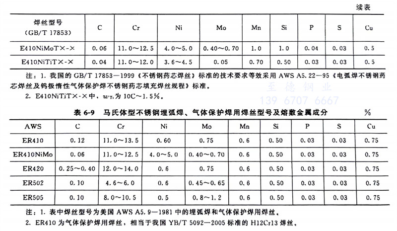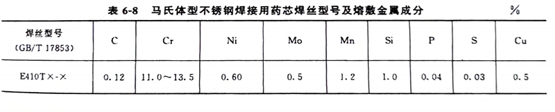 馬(ma)氏體型(xing)(xing)不銹(xiu)鋼焊接(jie)用藥芯焊絲型(xing)(xing)號及熔(rong)敷金(jin)屬(shu)成(cheng)(cheng)分(fen)(fen)見表(biao)6-8。馬(ma)氏體型(xing)(xing)不銹(xiu)鋼埋弧(hu)焊、氣體保護焊用焊絲型(xing)(xing)號及熔(rong)敷金(jin)屬(shu)成(cheng)(cheng)分(fen)(fen)見表(biao)6-9,其(qi)(qi)焊縫(feng)熔(rong)敷金(jin)屬(shu)成(cheng)(cheng)分(fen)(fen)與藥芯焊絲熔(rong)敷金(jin)屬(shu)相(xiang)比較,除了Si、Cu、Mn含(han)量有些區(qu)別外,其(qi)(qi)他合(he)金(jin)元(yuan)素含(han)量基本(ben)一致。