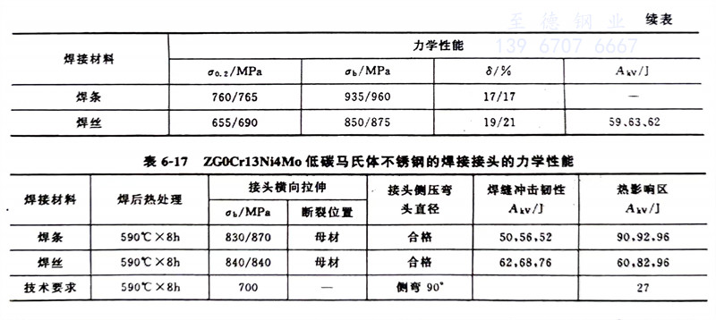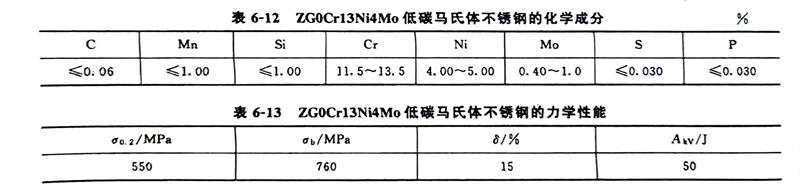 表(biao)6-12 ZG0Cr13Ni4Mo低碳(tan)馬(ma)氏(shi)體不銹(xiu)(xiu)鋼(gang)的化學(xue)成分,表(biao)6-13 ZG0Cr13Ni4Mo低碳(tan)馬(ma)氏(shi)體不銹(xiu)(xiu)鋼(gang)的力學(xue)性能
