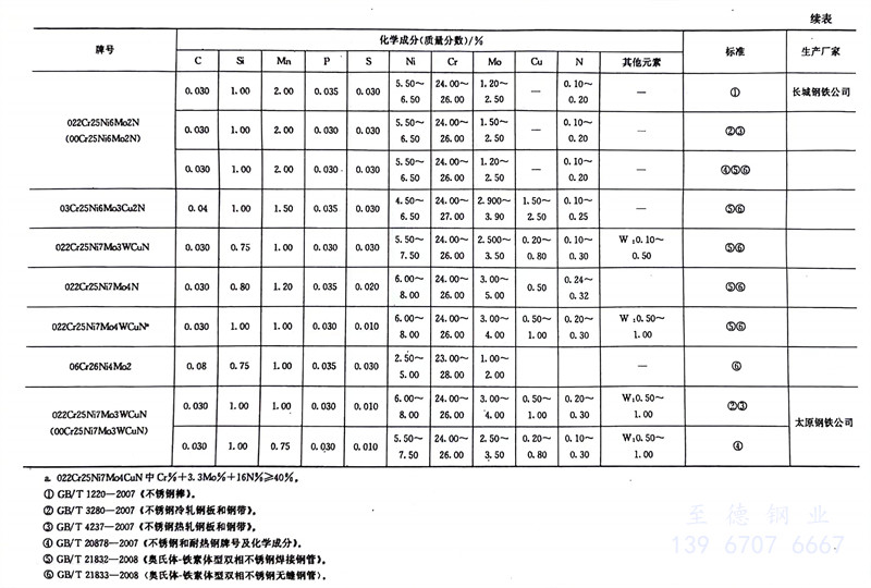 022Cr22Ni5Mo3N(原牌號為00Cr22Ni5Mo3N)已納人 GB/T 1220、GB/T 3280、GB/T 4237、GB/T 20878、GB/T21832、GB/T 21833等標準中。該牌號材料包括鋼棒、鋼板、焊接鋼管、無縫鋼管等,化學成分見表7-1,該鋼相當于瑞典的SAF2205 雙相不銹鋼(中國在20世紀80年代初開始試制相當于SAF2205 鋼的00Cr22Ni5Mo3N)。