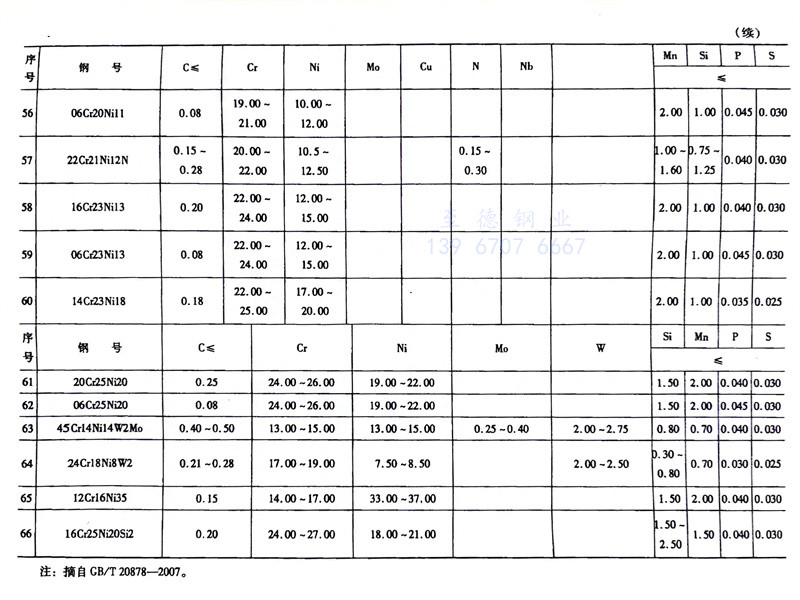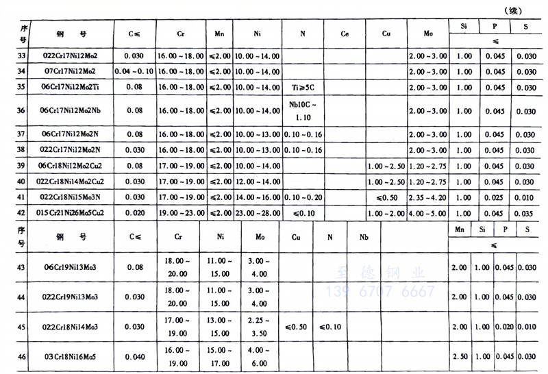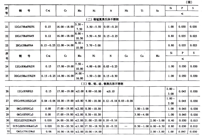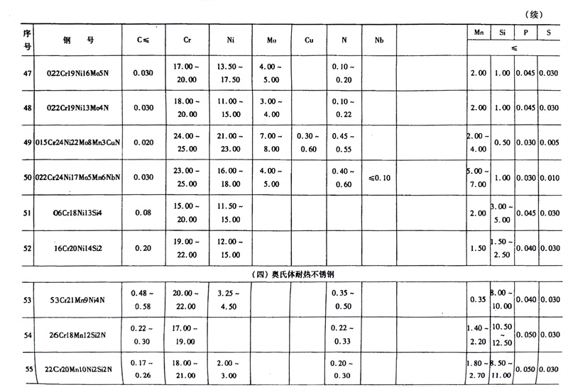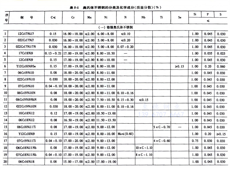 奧氏(shi)體不(bu)(bu)(bu)(bu)銹(xiu)鋼(gang)(gang)(gang)是不(bu)(bu)(bu)(bu)銹(xiu)鋼(gang)(gang)(gang)中(zhong)品種最(zui)多(duo)的(de),也是應用最(zui)廣泛的(de),在GB/T20878中(zhong)共(gong)有66種。本書按其化學成分和用途分為鉻鎳(nie)奧氏(shi)體不(bu)(bu)(bu)(bu)銹(xiu)鋼(gang)(gang)(gang)、鉻猛氮奧氏(shi)體不(bu)(bu)(bu)(bu)銹(xiu)鋼(gang)(gang)(gang)、鉬硅銅奧氏(shi)體不(bu)(bu)(bu)(bu)銹(xiu)鋼(gang)(gang)(gang)和耐熱(re)奧氏(shi)體不(bu)(bu)(bu)(bu)銹(xiu)鋼(gang)(gang)(gang)。其分類和化學成分見(jian)表5-1。