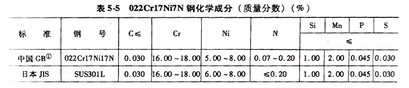 (1)化學成分: 022Cr17Ni7N、301L不銹鋼的化(hua)學成分見表5-5。