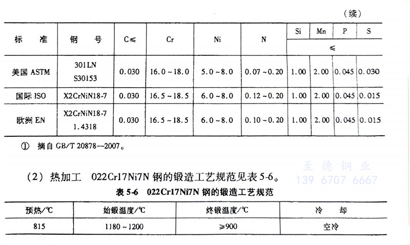 (2)熱加(jia)工: 022Cr17Ni7N、301L不銹鋼的鍛造工藝規范見表5-6。