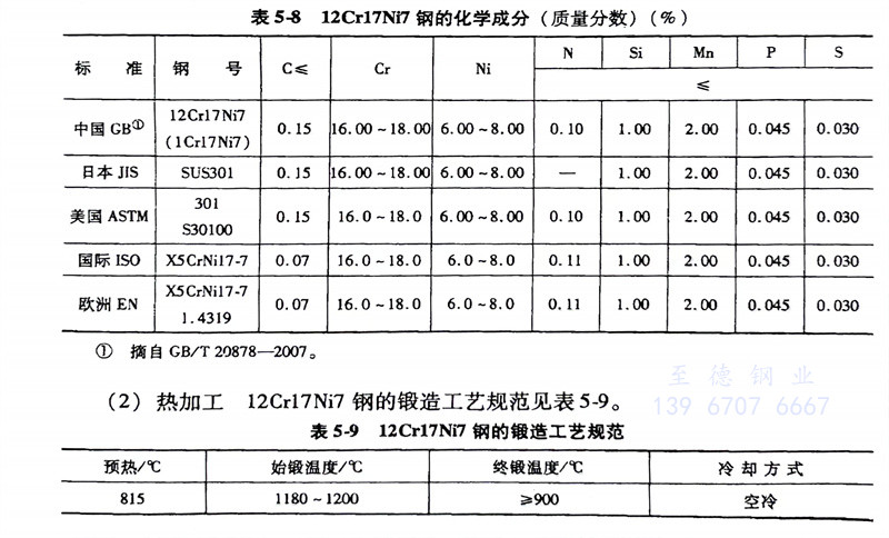 (2)熱加工: 12Cr17Ni7、1Cr17Ni7、1.4319、301不銹鋼的鍛造工藝規范見表5-9。