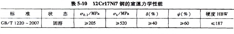 (5)力學性能: 12Cr17Ni7不銹(xiu)鋼(gang)的室溫力學性能(neng)見表5-10。