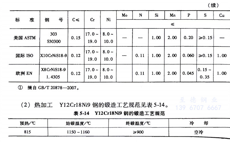 (2)熱(re)加工:Y12Cr18Ni9、1.4305、303不銹鋼的鍛造工藝規范見表5-14。
