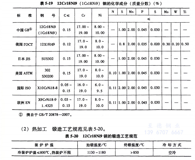 (2)熱(re)加工: 12Cr18Ni9、1Cr18Ni9、1.4325、302不銹鋼鍛造工藝規范見表5-20。