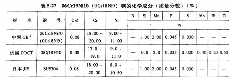 (1)化學成(cheng)分(fen): 06Cr19Ni10 、0Cr18Ni9、1.4301、S30408、304不銹鋼的化學成分見表5-27。