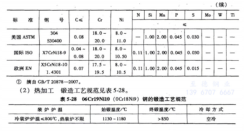 (2)熱加工: 06Cr19Ni10 、0Cr18Ni9、1.4301、S30408、304不銹鋼鍛造工藝規范見表5-28。