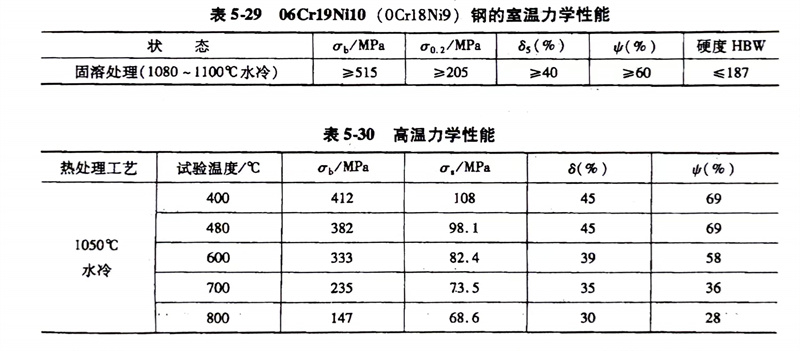 (5)力學性能: 06Cr19Ni10 、0Cr18Ni9、1.4301、S30408、304不銹(xiu)鋼的(de)力(li)學(xue)性能見表5-29和表5-30。
