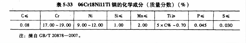 (1)化學(xue)成(cheng)分: 06Cr18Ni11Ti 、0Cr18Ni10Ti、321不銹鋼的化學成分見表5-33。