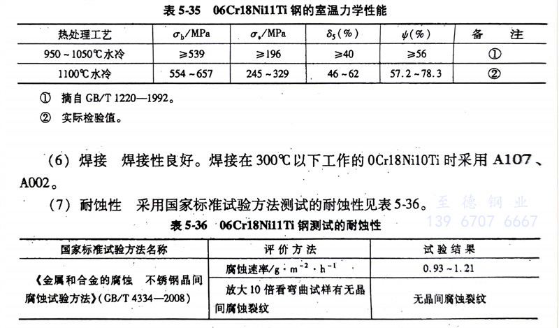 (5)力學性能: 06Cr18Ni11Ti 、0Cr18Ni10Ti、321不(bu)銹鋼的室溫力(li)學性(xing)能見表5-35。