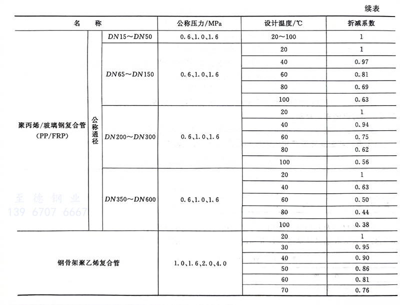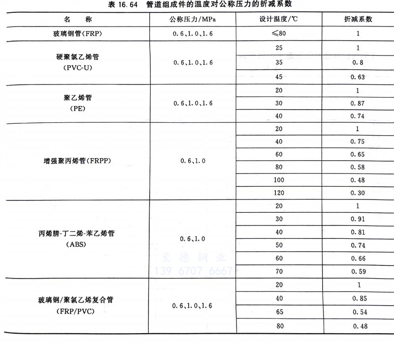 非金(jin)屬材(cai)料(liao)及其制品(pin)的選用應考慮溫(wen)度對公稱壓(ya)力的折(zhe)(zhe)減(jian)(jian),折(zhe)(zhe)減(jian)(jian)系數(shu)見表16.64。鋼骨架聚乙烯復合(he)管(guan)在輸(shu)送特殊(shu)危險性介質時(shi),應將修正后(hou)的公稱壓(ya)力再(zai)乘以0.8的折(zhe)(zhe)減(jian)(jian)系數(shu)。