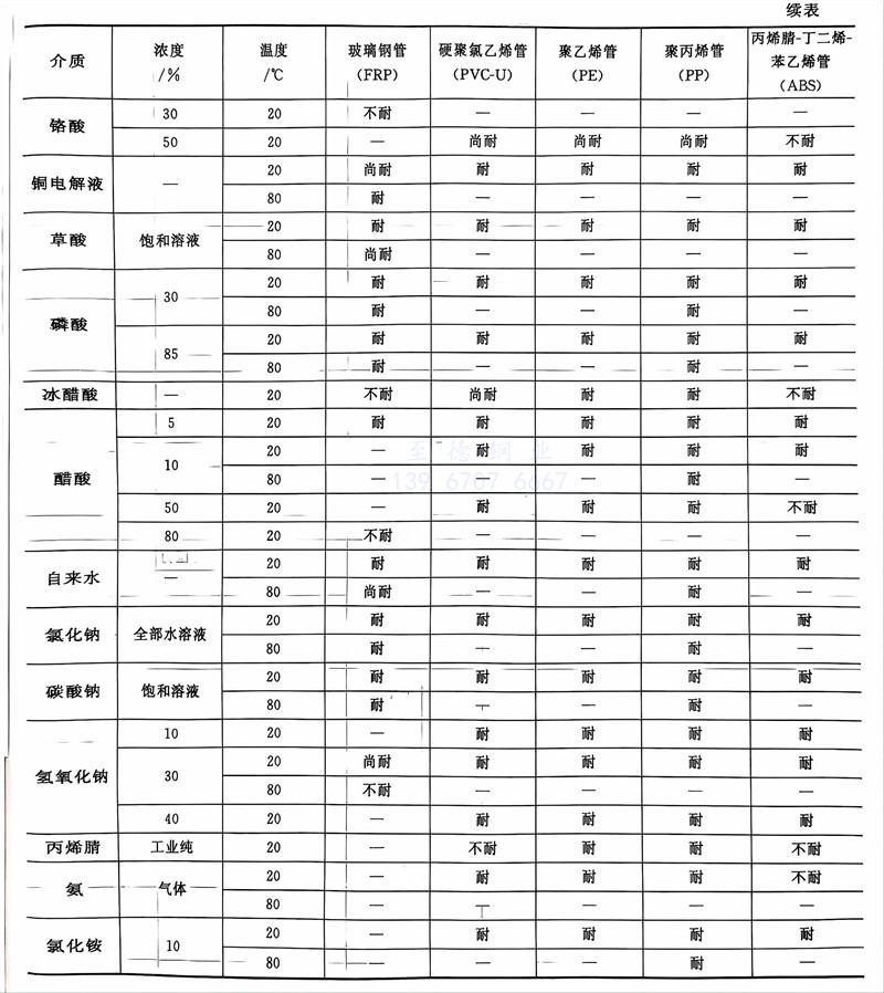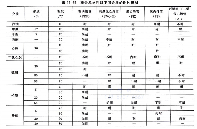 非金屬材料管(guan)道對不同介(jie)質的(de)耐蝕(shi)限制(zhi)