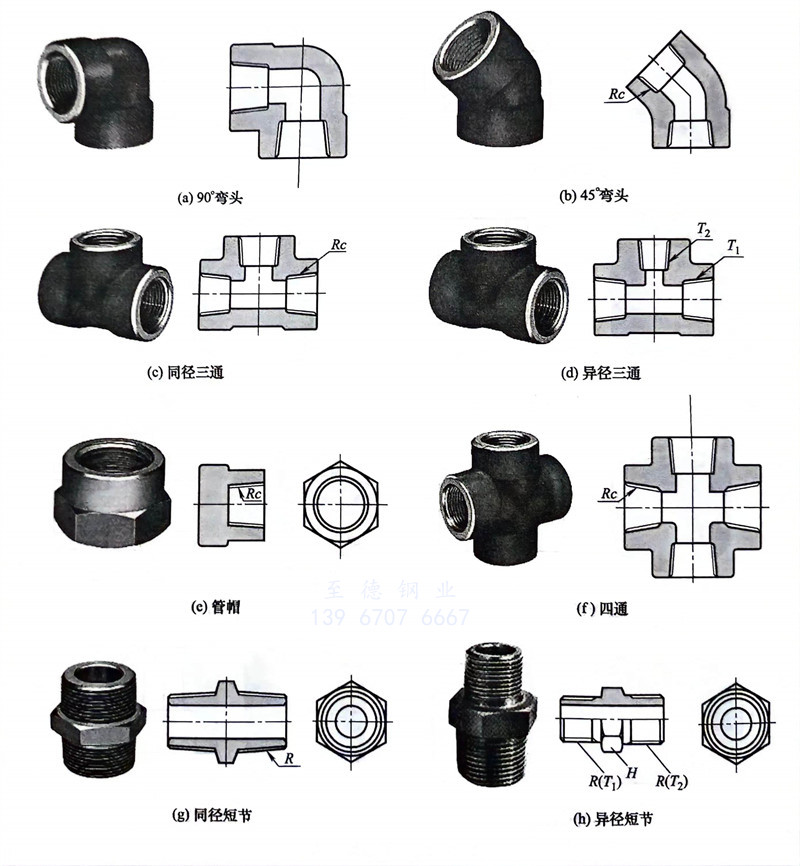 常用材料有鍛鋼、鑄鋼、鑄鐵、可鍛鑄鐵,石油化工裝置的工藝管道大多選用鍛鋼制錐管螺紋管件。常用鍛鋼制螺紋管件的標準有 HG/T 21632、GB/T 14626、GB19326、ASME B16.1、GB 3287、MSS SP83、MSS SP97、MSS SP95、GB 8464、API602。螺紋連接也多用于DN≤40mm的管子及其元件之間的連接,常用于不宜焊接或需要可拆卸的場合。管螺紋分圓錐管螺紋和圓柱管螺紋兩種,一般管件、設備采用圓柱管螺紋,管子采用圓錐管螺紋,除安裝方便外密封性能也好。可鍛鑄鐵管件大都采用圓錐管螺紋,它與采用圓錐管螺紋的管子連接,效果極佳。